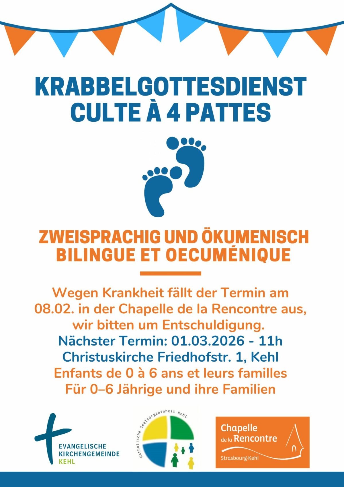 Die Krabbelgottesdienste richten sich an Kinder bis 6 Jahre alt, begleitet von ihrer Familie. Aber vielleicht haben etwas ältere Kinder auch Lust, Mal vorbeizuschauen? Wir singen, bewegen uns, lesen eine Geschichte aus der Bibel und beten… auf Deutsch und auf Französisch! Und unser Schäfchen macht natürlich mit. Der Gottesdienst dauert etwa 30 Minuten.