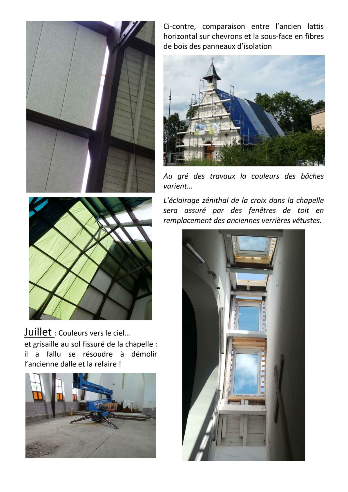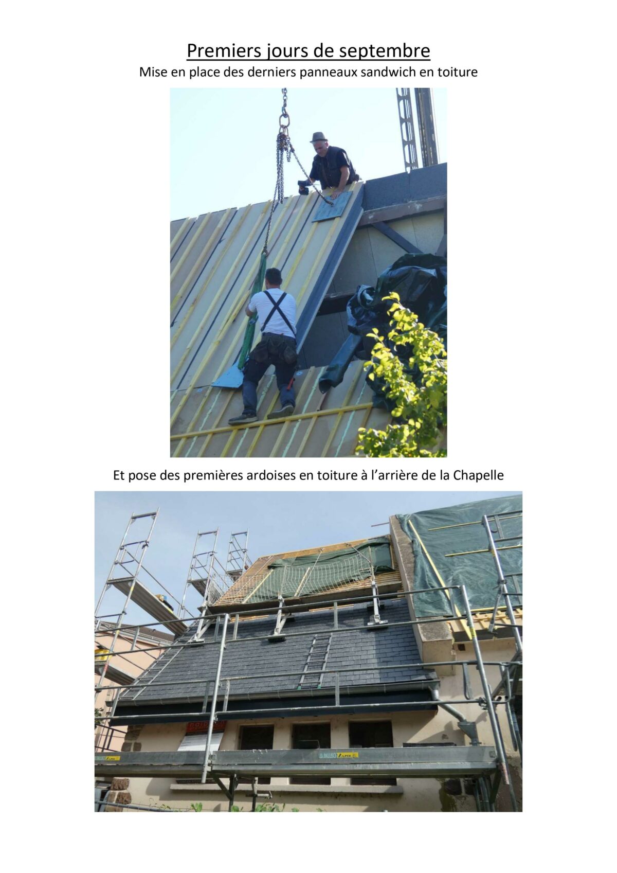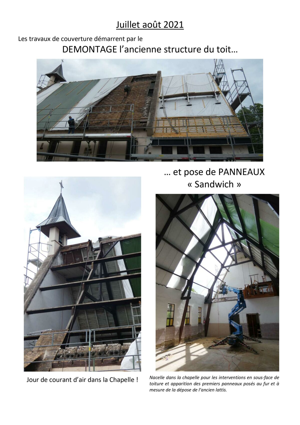 Après les travaux de désamiantage de juin 2021, la dépose de l’ancienne toiture avec ses structures a pu être réalisée en juillet. Pendant l’été 2021, la mise en place spectaculaire des panneaux « sandwich » – combinant sous-face intérieure, isolation thermique et un support de couverture – a permis la pose de la nouvelle couverture en ardoise véritable cet automne. Depuis mi-novembre la toiture de la Chapelle est resplendissante ! La petite cloche a quitté provisoirement son clocheton pour se refaire une santé en atelier, son retour est prévu pour l’été 2022.