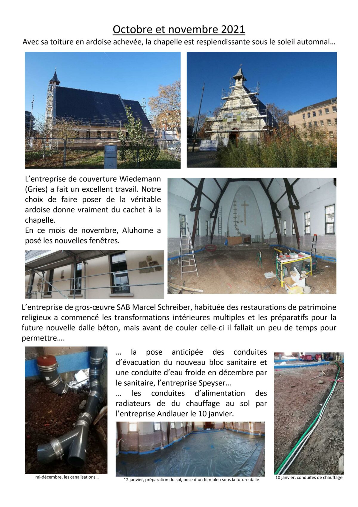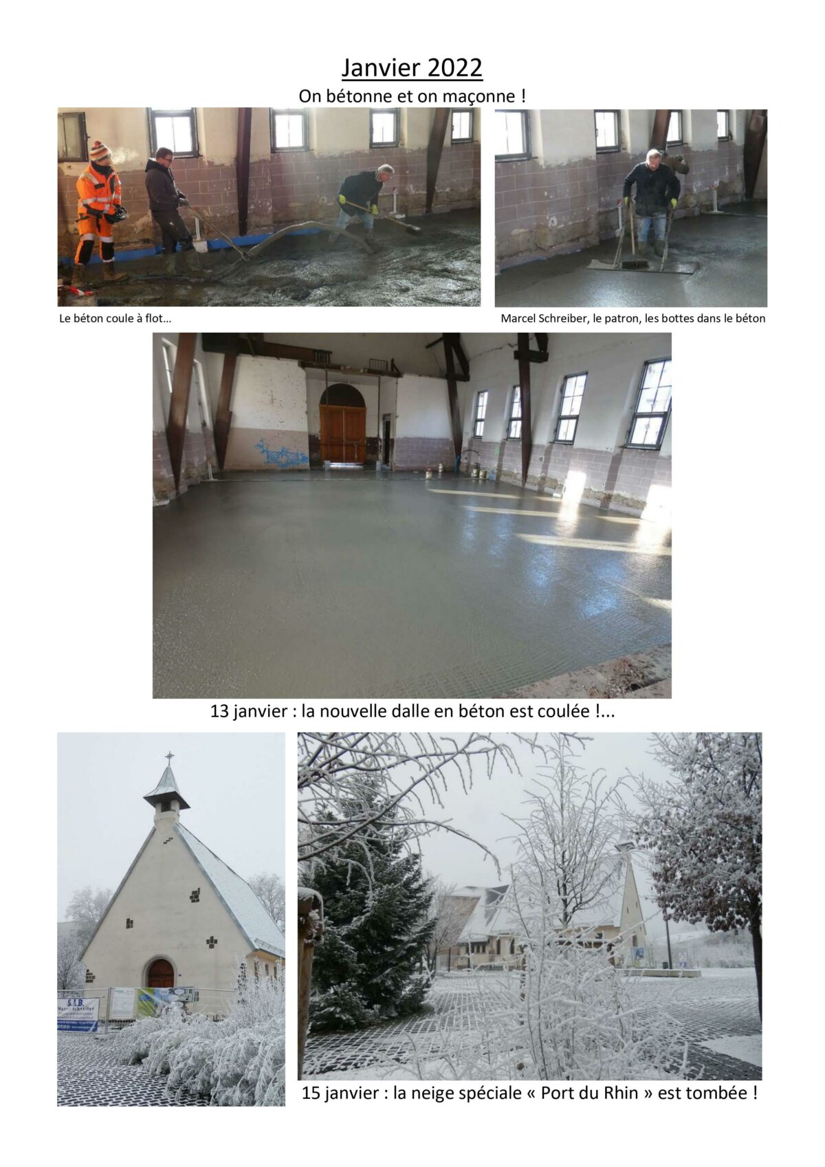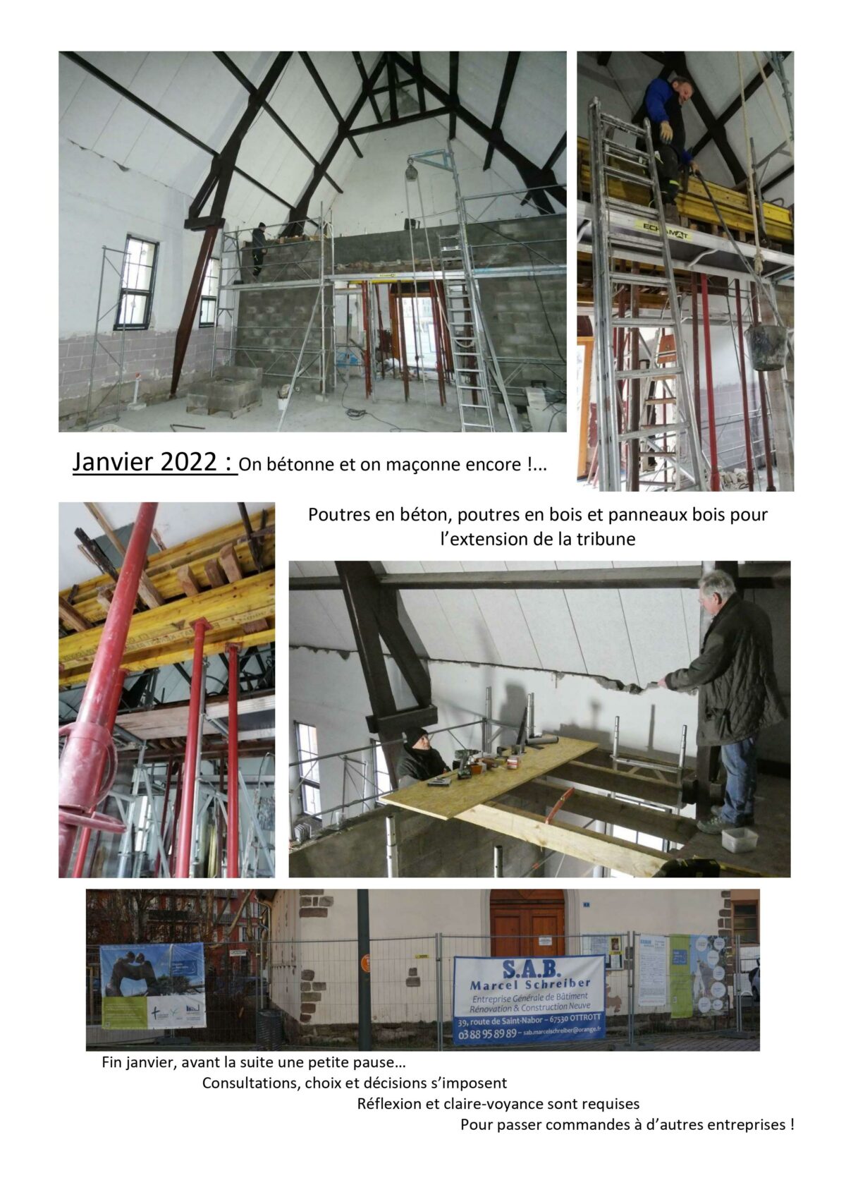 Les nouvelles fenêtres ont été posées en novembre 2021. Depuis, à l’intérieur, il y a eu les poses de conduites d’évacuation du futur bloc sanitaire et d’une conduite d’eau froide puis les conduites d’alimentation des radiateurs et du chauffage au sol. En janvier 2022, l’entreprise de maçonnerie, habituée des restaurations de patrimoine religieux, a commencé les transformations intérieures. Le 13 janvier, la nouvelle dalle a été coulée. Actuellement, les consultations pour la suite des travaux sont en cours.